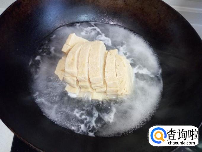 冻豆腐放入冷水锅中烧开煮一下。把冻豆腐放入水中煮,一个是解冻,再有就是可以去除豆腐上的苦涩味,这样才更好吃。冻豆腐完全解冻后,用冷水过凉,然后把水分攥干。