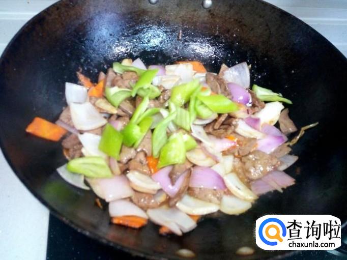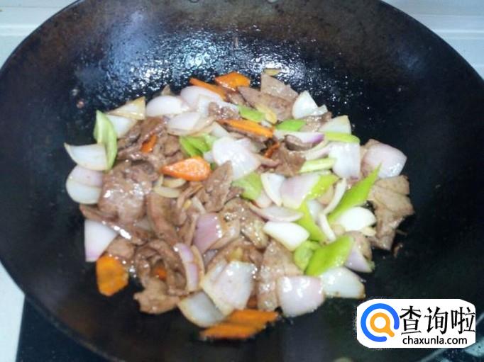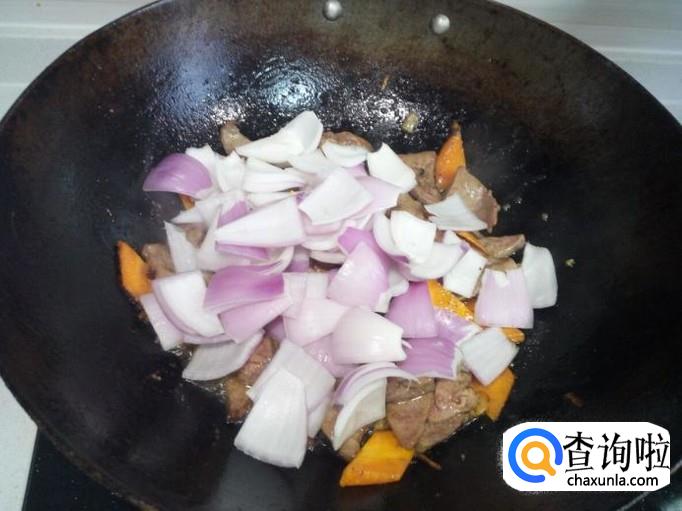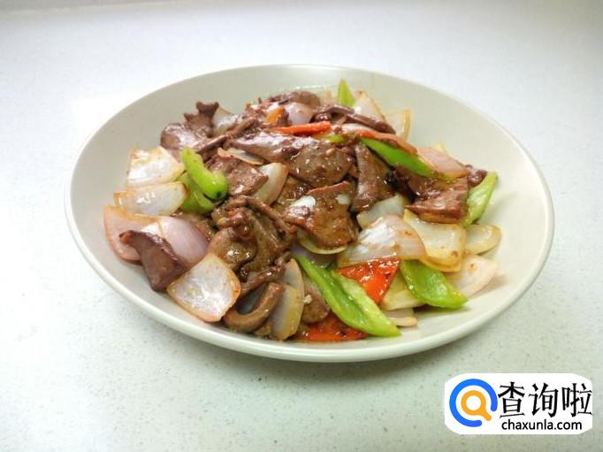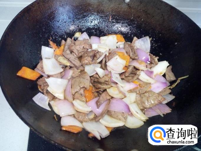 炒至羊肝变脆,表面坚挺,放入圆葱,大火爆炒,放入少许醋,盐。