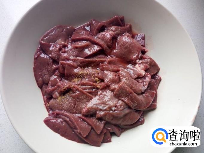 把买回来的羊肝,放入清水中浸泡两个小时,去除血水。然后用水清洗干净,控干水分,切成薄片。放入少许五香粉,盐,料酒,腌制十分钟。
