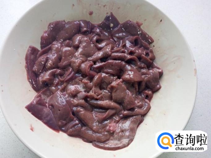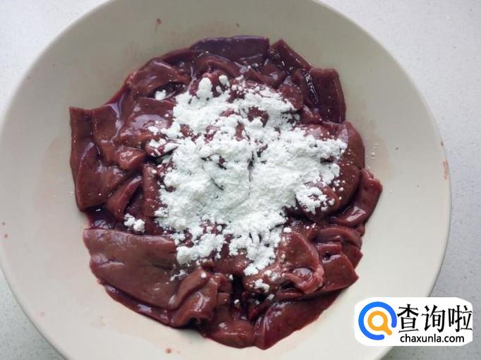 腌制好的羊肝,放入1匙儿淀粉,用手抓匀挂糊。