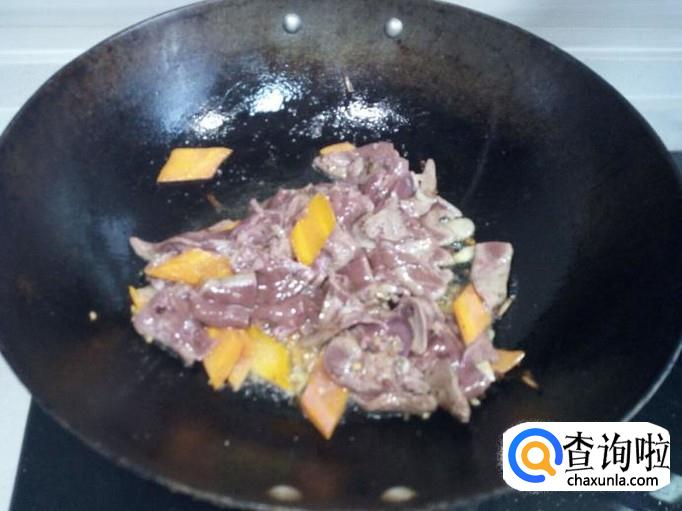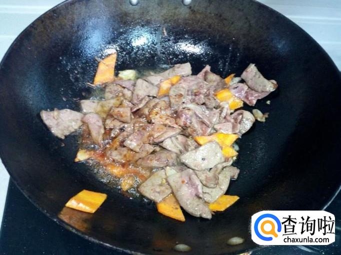 胡萝卜片变软后,放入羊肝快速翻炒,放入料酒,白糖,酱油。
