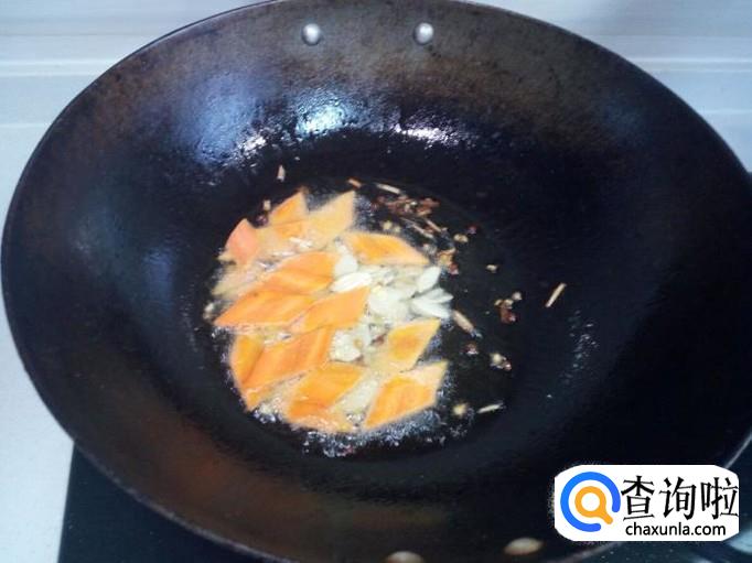 锅内放入油加热,油热后放入花椒,葱,姜,蒜,爆锅,放入胡萝卜片翻炒。