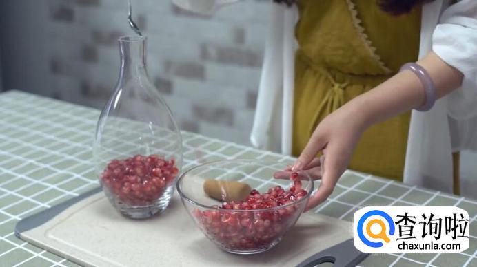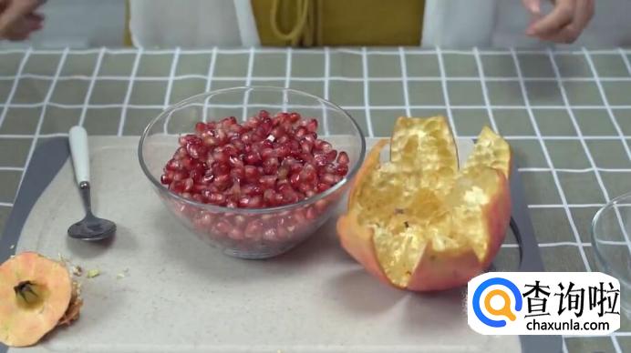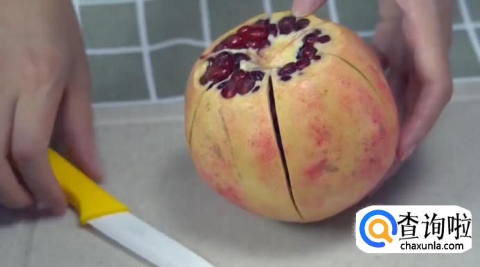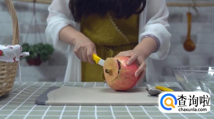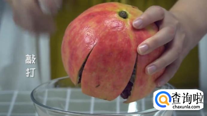 石榴倒着,敲打,让石榴的果实都掉入碗中。