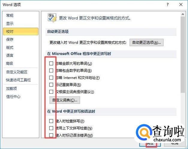 之后我们将校对里面的所有勾选框里面的勾选全部点击取消掉,最后我们点击确定,这样我们就解决掉这个问题了。