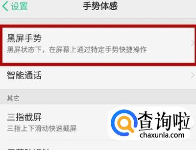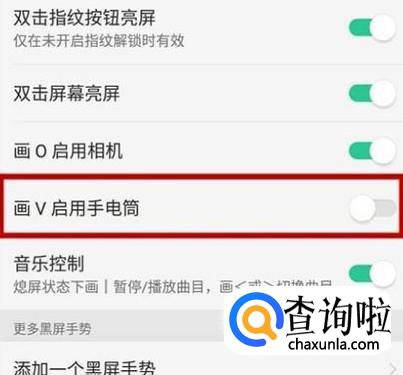 在黑屏手势中找到并开启画v启用手电筒,黑屏是画V就可开启电筒,画o即可关闭