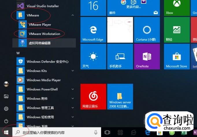 启动Windows 10操作系统,如图所示。点击任务栏"开始"按钮,弹出开始菜单选择"VMware→VMware Workstation"项。