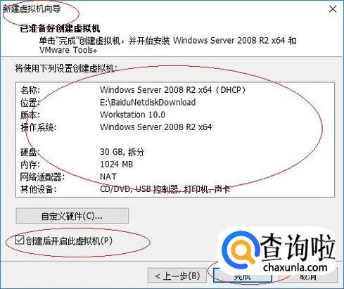 如图所示,显示"将使用下列设置创建虚拟机"信息。勾选"创建后开启此虚拟机"复选框,点击"完成"按钮。