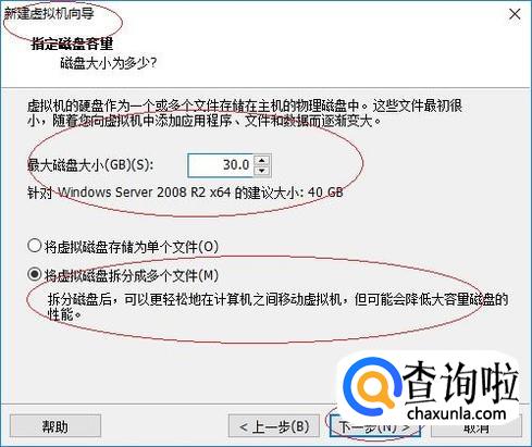 指定虚拟机的硬盘容量,如图所示。选择"将虚拟磁盘拆分成多个文件"单选框,设置完成点击"下一步"按钮。
