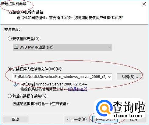 如图所示,选择"安装程序光盘映像文件(iso)"单选框。点击右侧"浏览"按钮,选择光盘映像文件。