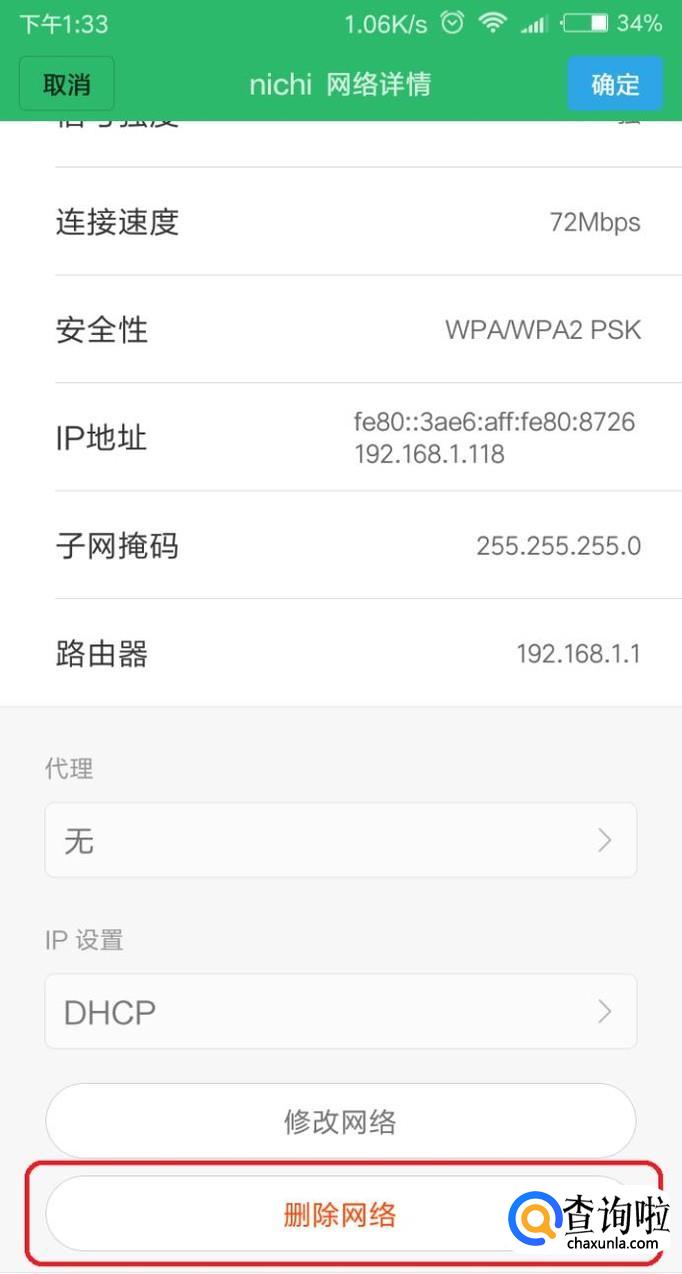 选中将要上传的WiFi,拉到页面底部选择删除(比如删除nichi)。