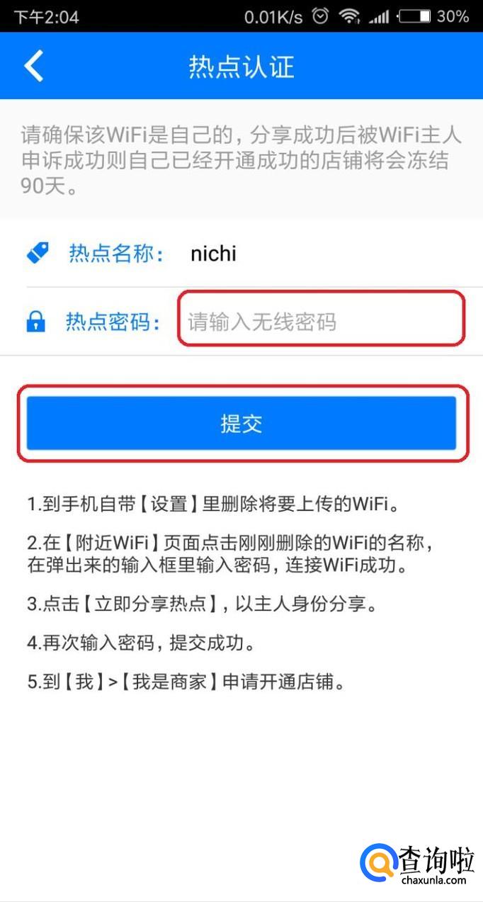 3、请不要将他人的WiFi以主人身份提交,其他人的WiFi其他人也需要提交,否则被其他人申诉成功后自己已经开通成功的店铺将会冻结90天。
