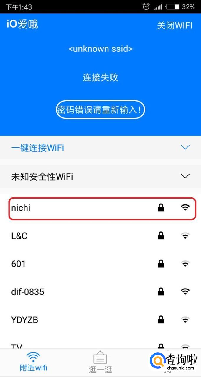 不做任何设置,打开爱哦客户端,打开【附近WiFi】页面,并点击刚才删除的WiFi名称。(比如点击nichi)
