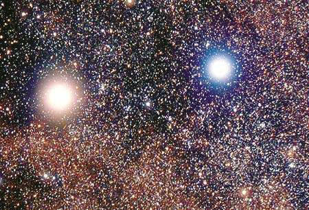 比邻星位于从地球看来西南方向2度的位置,为一颗红矮星。下图影像中央这颗小小的红色星就是比邻星,它是如此的昏暗,直到1915年才由当时约翰内斯堡(Johannesburg)联合天文台(Union Observatory)的主管罗伯特·因尼斯(Robert Innes)在南非发现。影像的背景里可以见到我们银河系里各式各样的恒星。南门二系统里的最亮星,其特性和我们的太阳很相像,也是夜空中的第三亮星 。欧洲的天文学家们宣布他们发现在距离我们最近的一颗恒星(太阳除外)周围发现了质量和地球相仿的行星。这一发现开启了系外行星探测的新时代,来自其它太阳系的崭新世界。尽管这颗行星绝不可能是第二颗地球,因为它距离恒星太近,正不断受到高温的炙烤。这颗行星围绕半人马座αB星运行,半人马座α星本身是一个三星系统,距离地球约4.3光年。从天文的角度来看,这样的距离简直就是在自家后院一般。