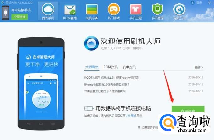 然后我们将手机用数据线连接电脑后点击刷机大师首页的“立即连接。”
