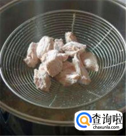选择瘦猪肉清洗干净,切成小方块,用开水焯一分钟,变色后捞出来,用冷水洗一下。