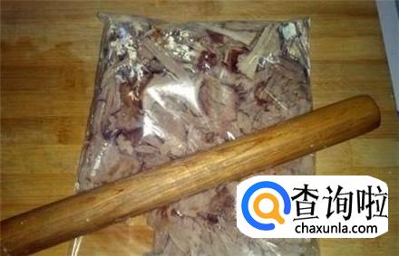 熟了之后倒出来,将肉块捡出来晾干,装进食品袋里用擀面杖敲打到肉质松散,用手撕成长条。