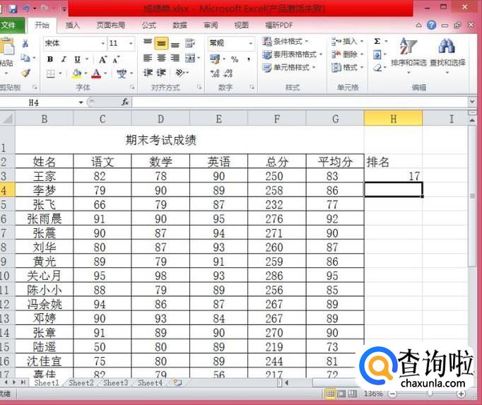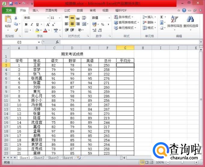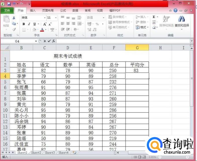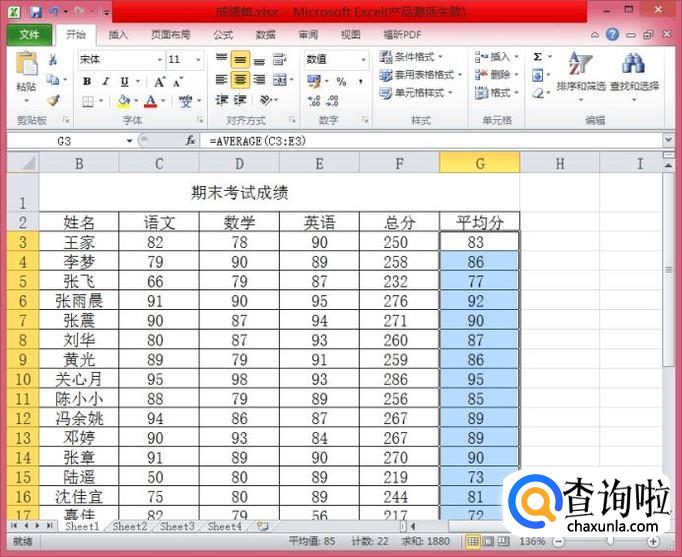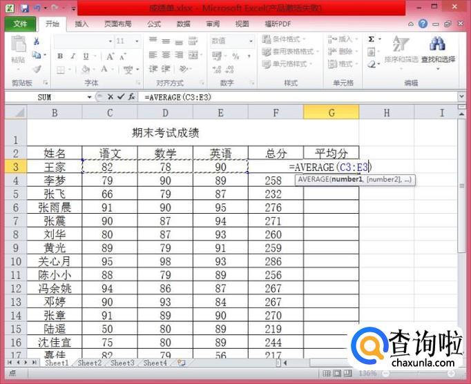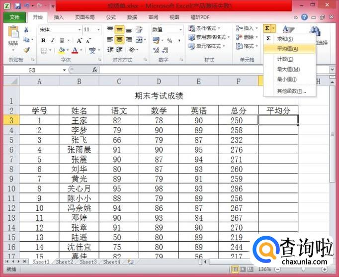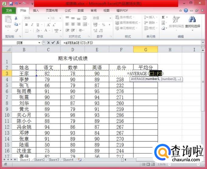 点击”平均值“此时计算机自动选择的范围有误(包含了总分)
