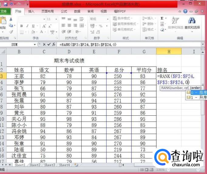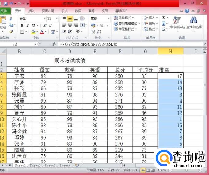 在平均分旁边加”排名“列,并在H3单元格内输入函数”=RANK(F3:F24,F3:F24,0)"