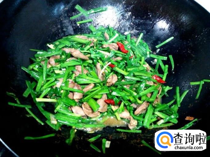 鸡心非常容易熟,稍翻炒即可,然后放入勾兑好的芡汁。芡汁粘稠后,放入韭菜翻炒。