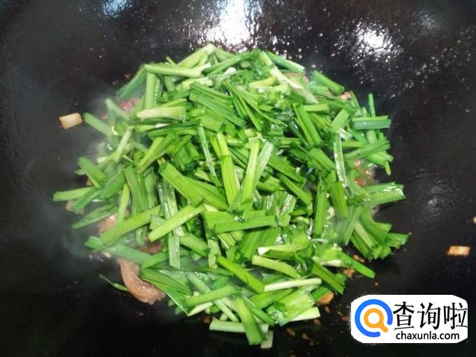 炒至韭菜变色,刚发亮光,立即关火。放入味精,关火出勺。