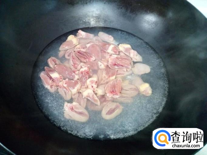 鸡心用水焯一下,水开后入锅10秒钟捞出,用水冲洗掉血水和沫子,沥干水分。