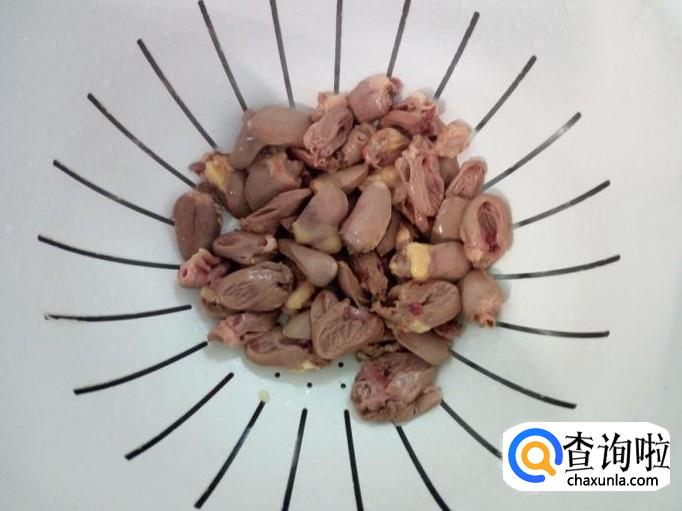 鸡心用水清洗干净,控干水分。用刀在中间断开,切成对半,去除上面的血管和血水。