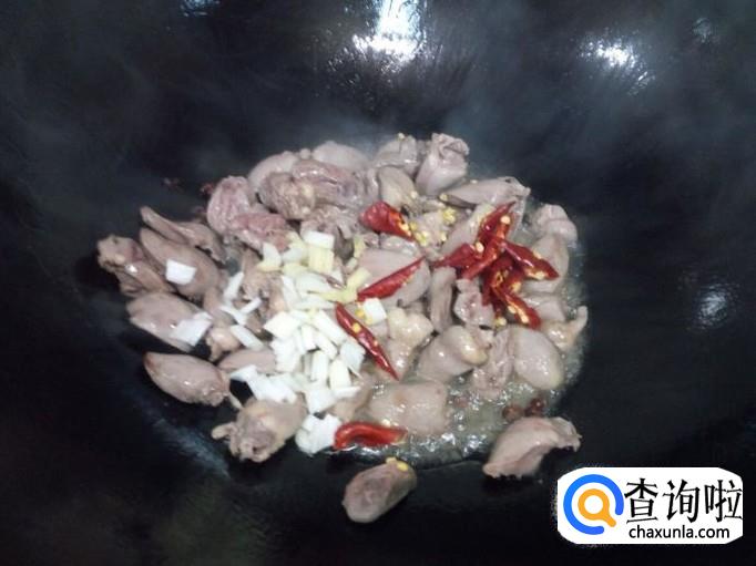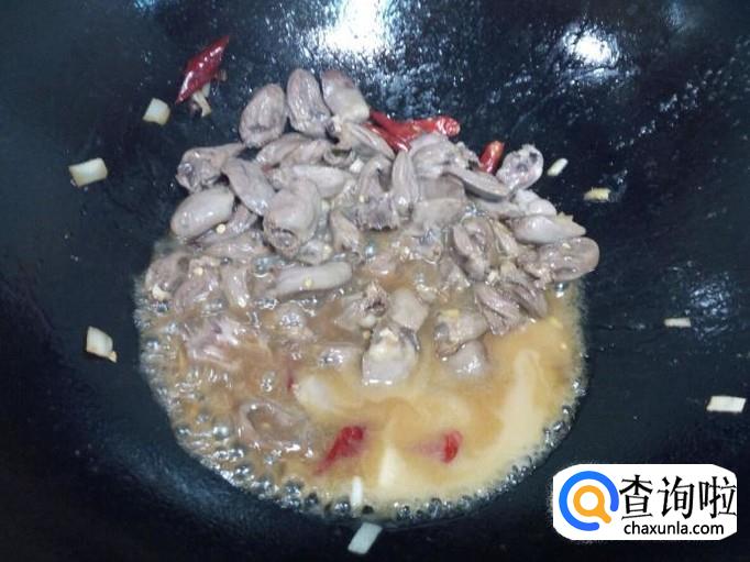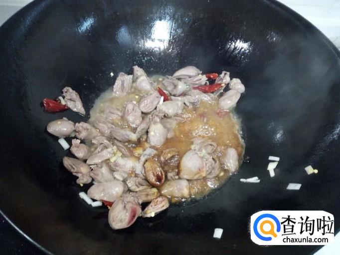 鸡心略翻炒一下,然后放入葱,姜,红干椒,翻炒。放入料酒,酱油,盐。