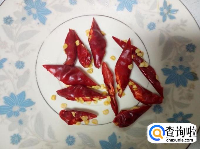 红干椒用水清洗干净,控干水分,斜刀切成对半。切好葱,姜,备用。