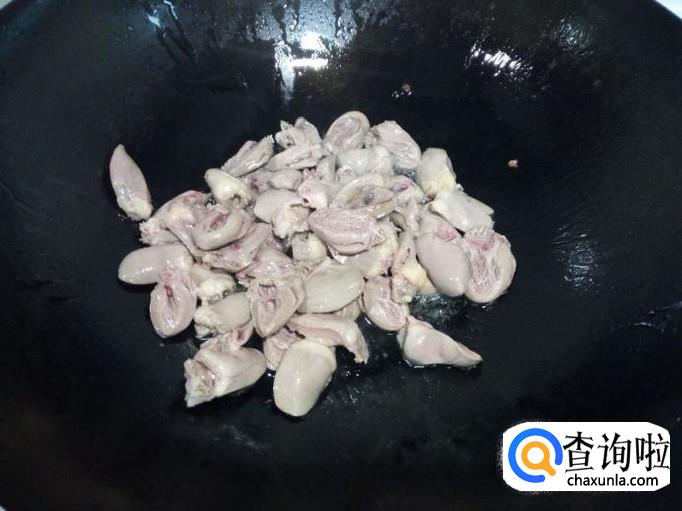 锅里放入油加热,油热后放入花椒爆锅,放入鸡心翻炒。