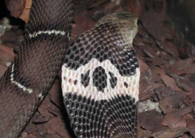 [识别特征]全长1000~2000 mm。具前沟牙的毒蛇。背面黑色、黑褐色或暗褐色,没有或具有若干白色或黄白色窄横纹,在幼体较为明显。受惊扰时,前半身竖起,颈部扁平扩展,显露出项背特有的白色眼镜状斑纹或此斑纹的各种饰变。