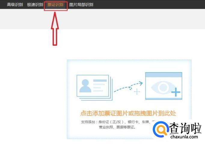 打开运行软件,有四个功能,“高级识别‘’“极速识别““票证识别”“图片局部识别“因为车牌照属于票证,这个时候我们就可以点击“票证识别”