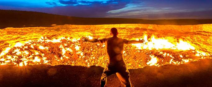 在土库曼斯坦拥有一个燃烧了五十多年,接近五十年的坑洞。这个被称作“通往地狱的门”的火坑最初是在1971年被苏联科学家发现的,在钻机下方坍塌以后,形成了一个宽大的洞口。据信该火山口释放了大量的甲烷气体,这对附近的土库曼斯坦村庄构成了潜在的危险。