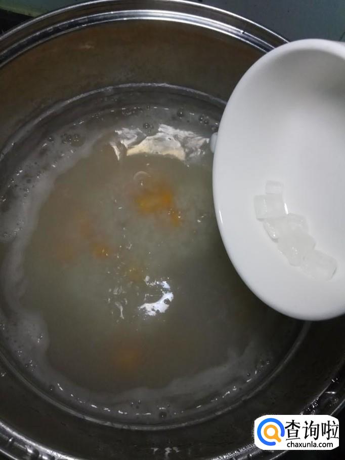 红薯比较容易熟,可以晚点儿放,煮30分钟之后,倒入红薯和冰糖,再煮15分钟。