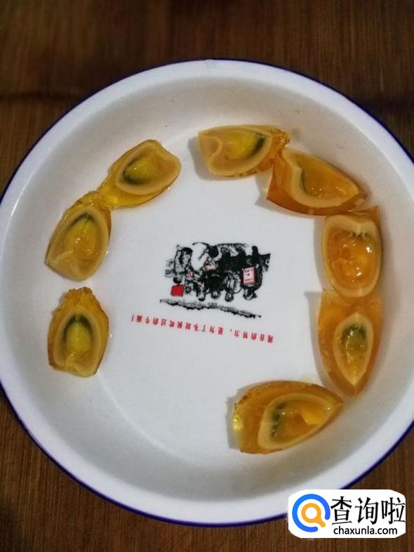 将一枚皮蛋切成四半,两枚八半装盘。
