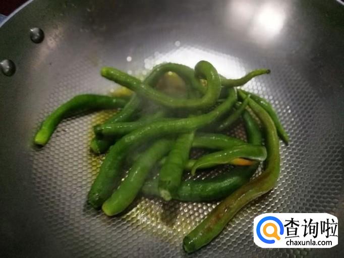 将青辣椒放到油锅中煎炒,加适量盐制成虎皮辣椒。