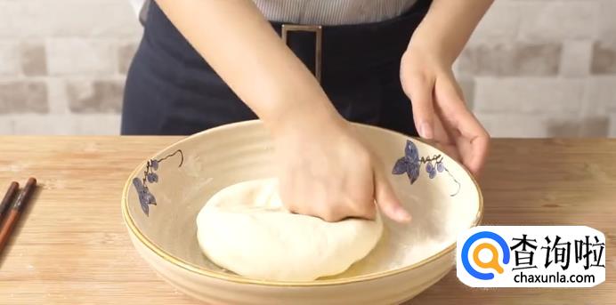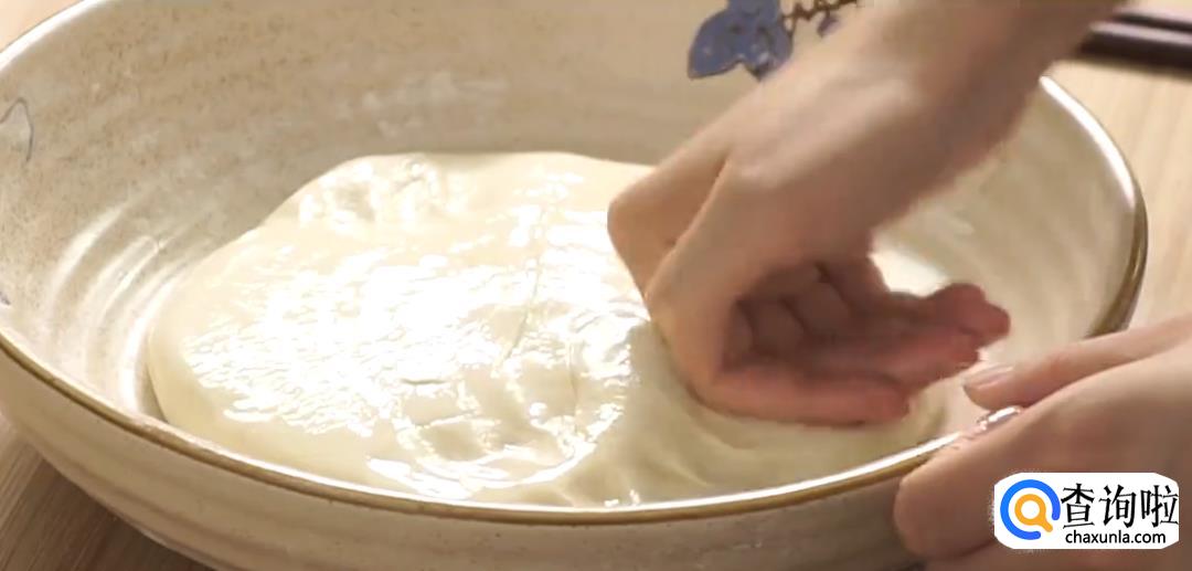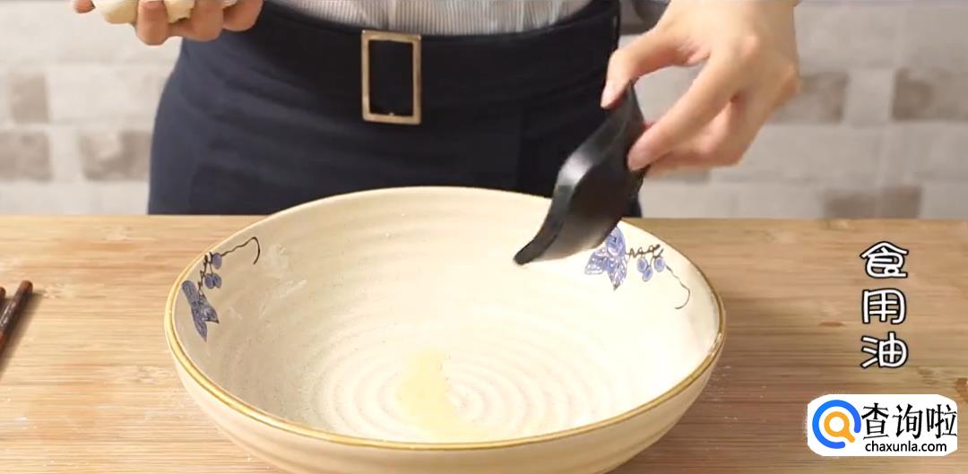 碗底倒入少量食用油,将面团均匀粘上油,然后压平,盖上湿布发面40分钟。