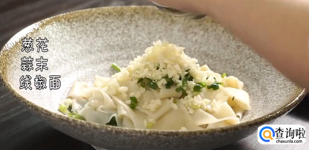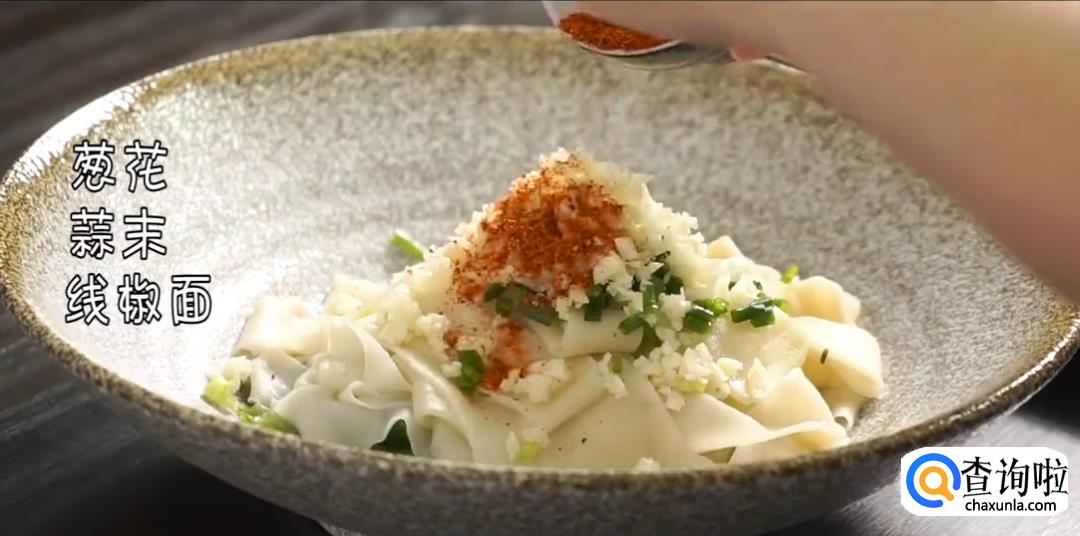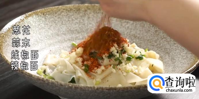 面皮上撒葱花,蒜蓉,线椒粉,辣椒粉。