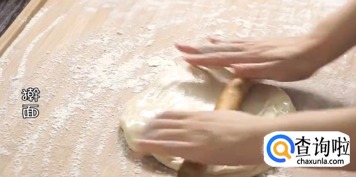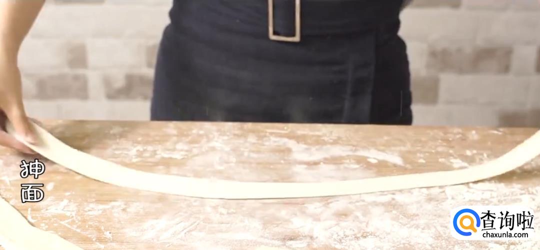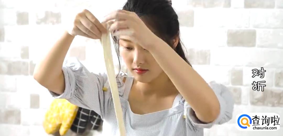 将每一块面皮拉伸,然后对折,在案板上放好。