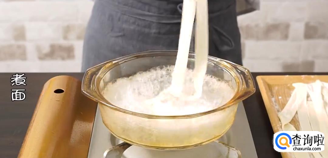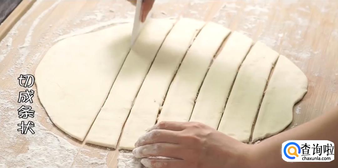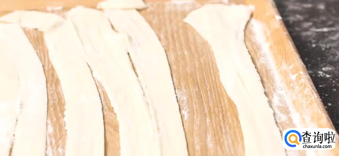 将面团放在沾面粉的案板上,用擀面杖擀面压平,然后用刀切成条状。