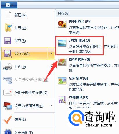 打开之后在“画图工具”的点击左上角如图示的图标将鼠标移到“另存为”上就会出现可修改的格式;