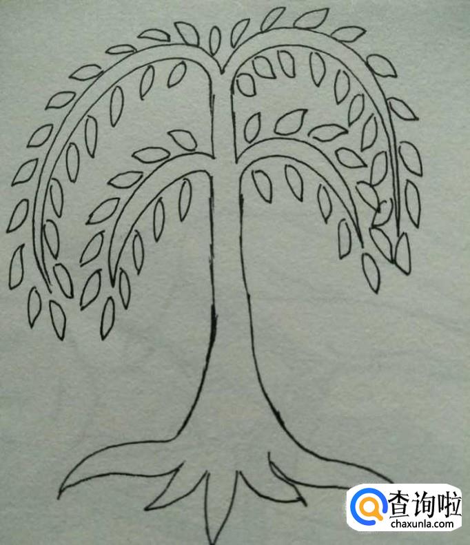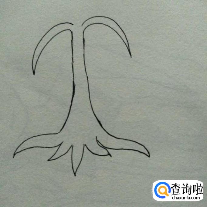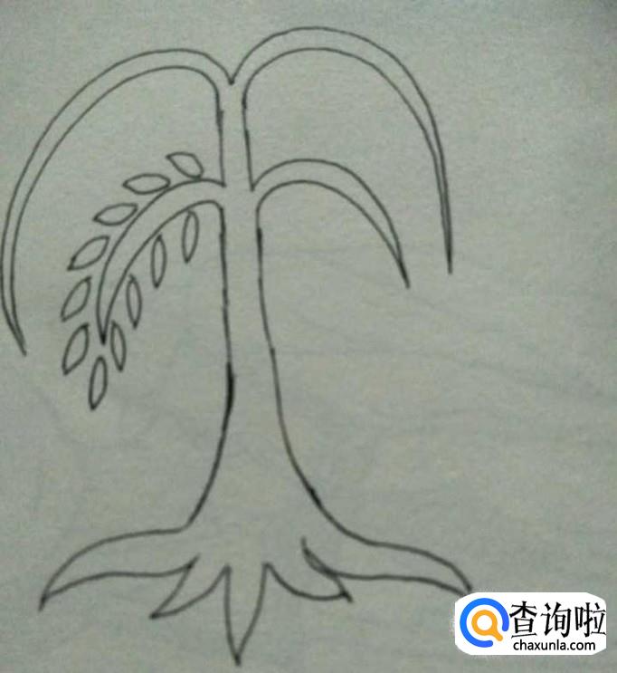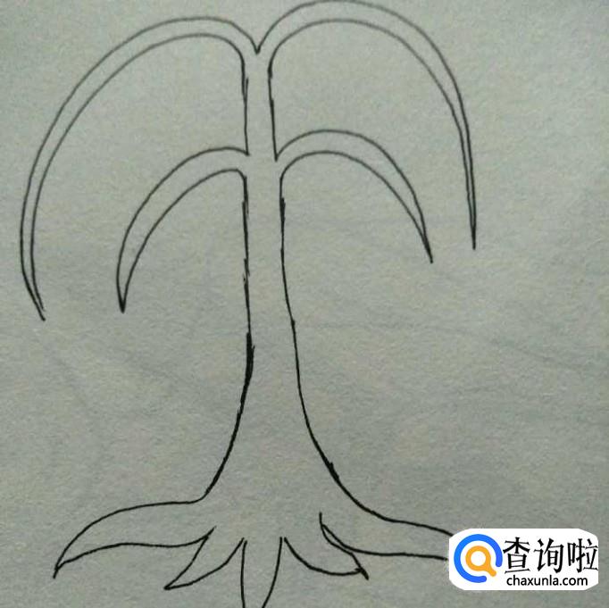 在根部的上方,描出两根相对于平行的线条作为小柳树的树干,这个树干不需要画的太直了,弯一点的树干能使柳树看起来更加的婀娜多姿。