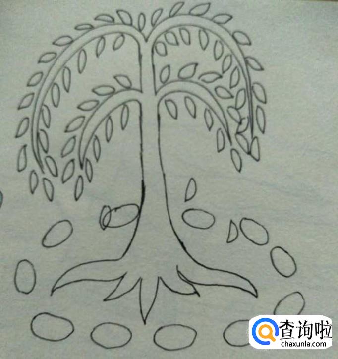 在树根的周围画出一些椭圆,这些椭圆就充当我们柳树的树埔,画好后如下图所示