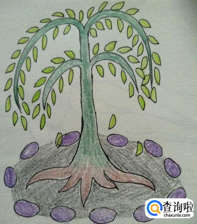 最后一步,我们用彩铅或者水彩笔给柳树涂色,叶子涂成青色,树干涂成绿色,鹅卵石涂成紫色,树埔涂成泥巴色,就欧克了。