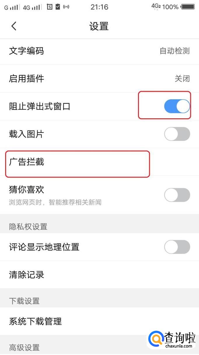 在设置里面,往下划动屏幕,如图所示,点击选中“阻止弹出式窗口”,点击“广告拦截”。