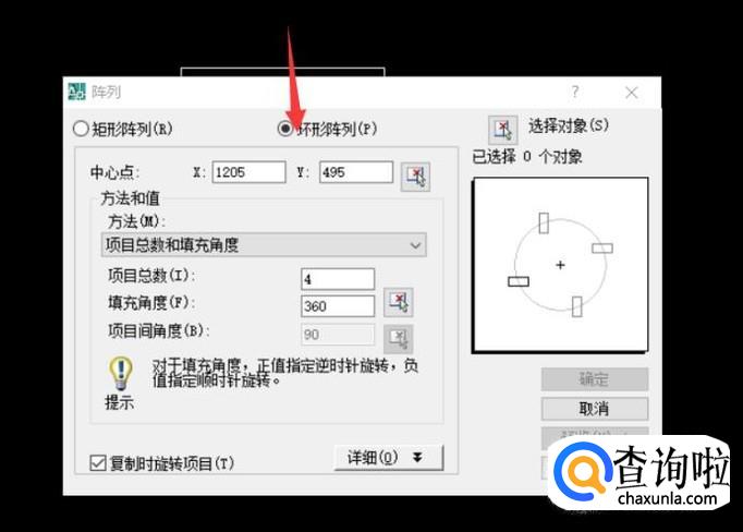如图中红箭头所示选择环形阵列,然后根据需要调整下面的属性,然后点击“选择对象”选择物体,然后点击确定即可,