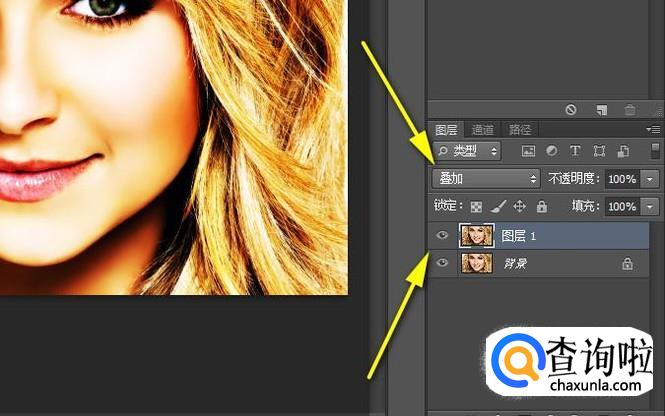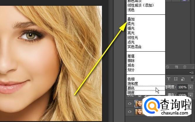 鼠标再点击混合模式的下拉按钮,弹出的下拉菜单中选中“叠加”这混合模式。看画布的人物图像已发生了变化。
