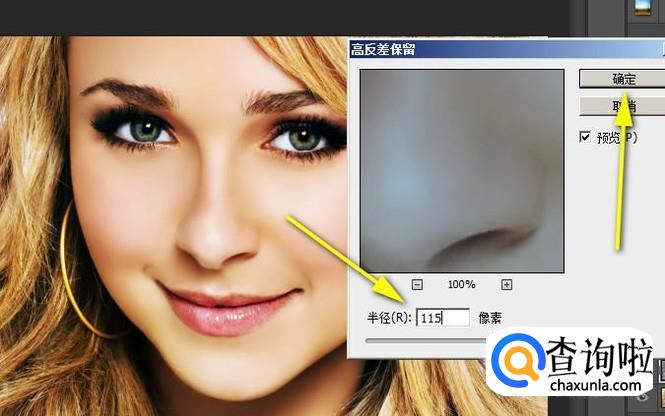 紧接着,给图层1添加高反差保留滤镜效果。在高反差保留的设置框中,把半径参数设置为115;再点右上角的确定。