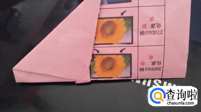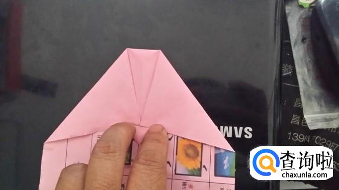 再把上图折成的尖角像图中那样向下翻折过来。这样上面又形成了两个角。