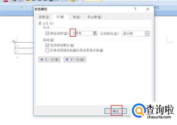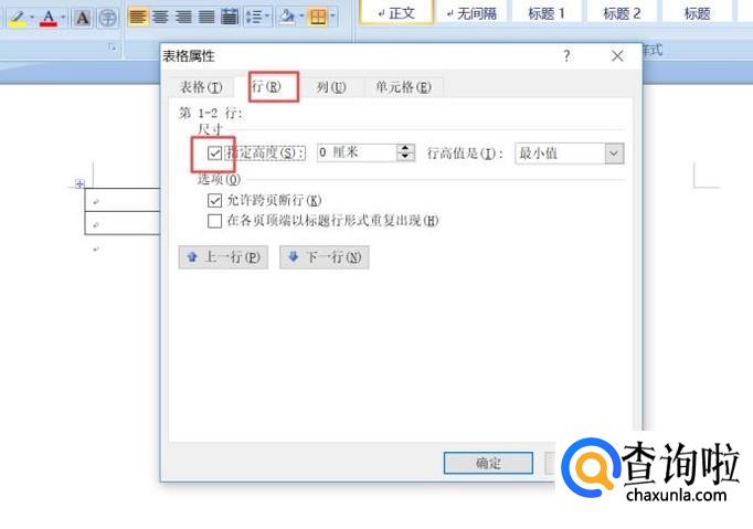 弹出的界面,我们点击行,然后将指定高度勾选上;