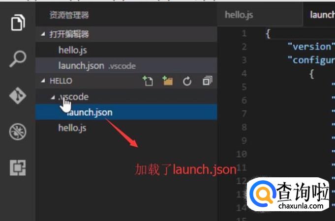 然后我们会看到资源管理器的HELLO文件夹下面多出了一个json文件,这就是NodeJS的配置文件夹,如下图所示